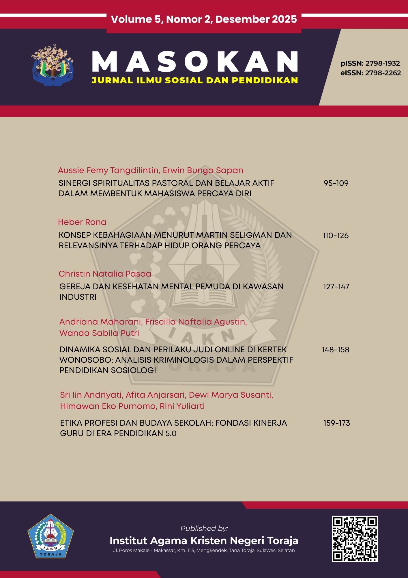 This journal published Volume 5, No. 2 (2025), on December 1, 2025. This issue features five scholarly articles contributed by authors from four academic institutions in Indonesia: Institut Agama Kristen Negeri Toraja, Sekolah Tinggi Filsafat Theologia Indonesia Timur in Makassar, Sekolah Tinggi Teologi Gereja Kristen Sulawesi Tengah in Tentena, Universitas Negeri Yogyakarta, and Universitas PGRI Semarang. The articles examine various interdisciplinary themes, such as the interplay between pastoral spirituality and active learning in fostering confident Christian students, Martin Seligman's notion of happiness and its theological significance for believers, the church's role in promoting youth mental health in industrial regions, criminological insights into online gambling behavior in Wonosobo, and the amalgamation of professional ethics and school culture as essential underpinnings for teacher performance in the context of Education 5.0. Together, these contributions provide theoretical insights and practical applications for education, theology, psychology, and social studies in contemporary Indonesian contexts.